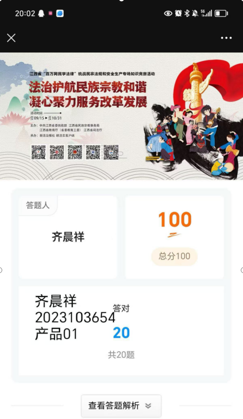为深入学习贯彻习近平法治思想,加强宪法和统战、民族、宗教、教育等方面,普及安全生产知识。一是开展法律相关知识和安全生产答题竞赛。组织学生通过“百万网民学法律”微信公众号参与“统战民宗法规专场”活动并收集答题情况。二是开展法律学习、安全生产和食品安全主题班会。班主任集中组织学生进行学习法律、安全生产和食品安全有关知识。三是加强网络宣传教育。在公众号发布相关推文,引导学生树立良好的法律、安全生产和食品安全意识。