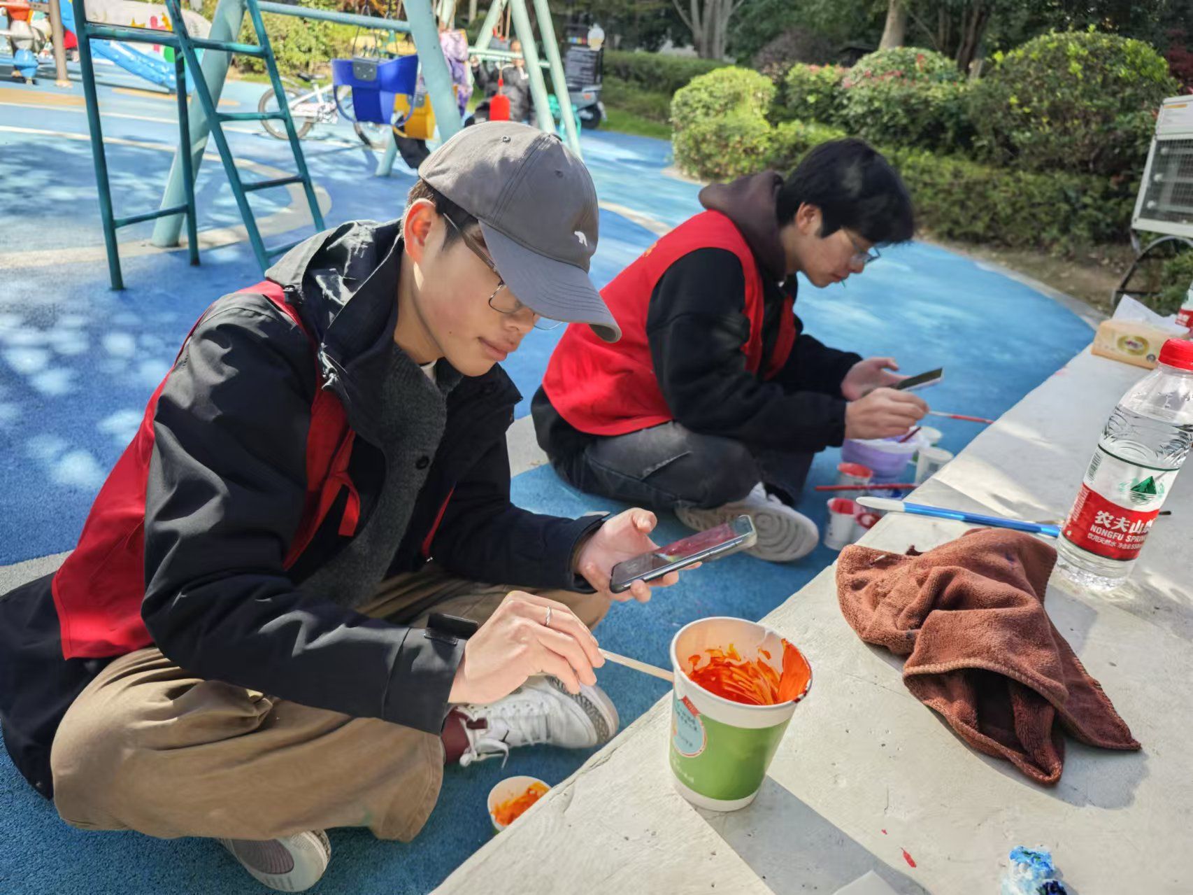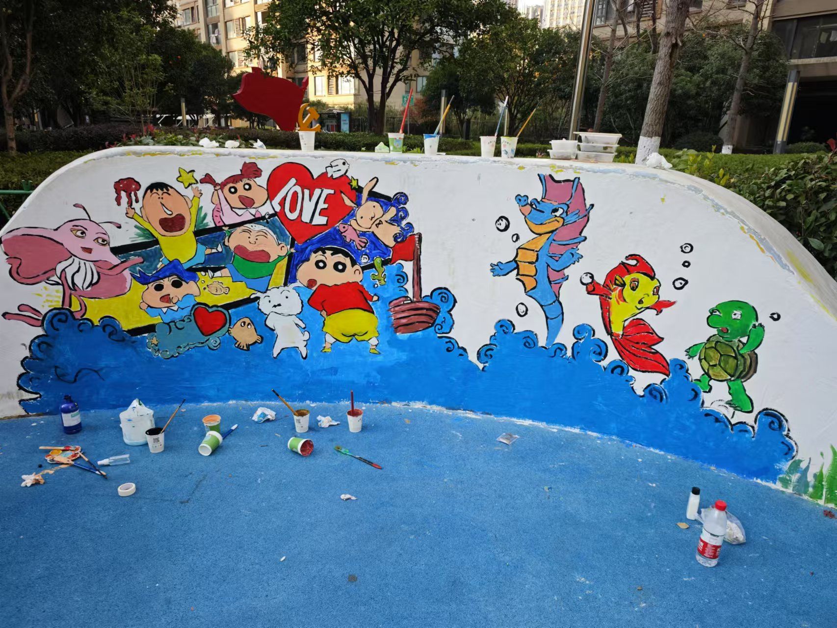 师生们在前期对墙面进行了测量和画面设计,以环保和节水为主题,以社区健身游乐区的墙壁为画布,旨在唤起人们对节约用水、保护环境的意识。志愿者们分工明确,精心设计图案,大胆调色,确保色彩和谐鲜艳,勾勒的细节力求人物活灵活现,经过不懈努力,原本单调的墙面焕然一新。墙面上,蓝色的海洋波涛起伏,海绵宝宝、派大星欢快嬉戏,美人鱼优雅游动,五彩鱼群穿梭在珊瑚间,画面充满生机。路过居民纷纷驻足,脸上满是惊喜与赞叹,孩子们更是兴奋地述说着自己的童话故事。