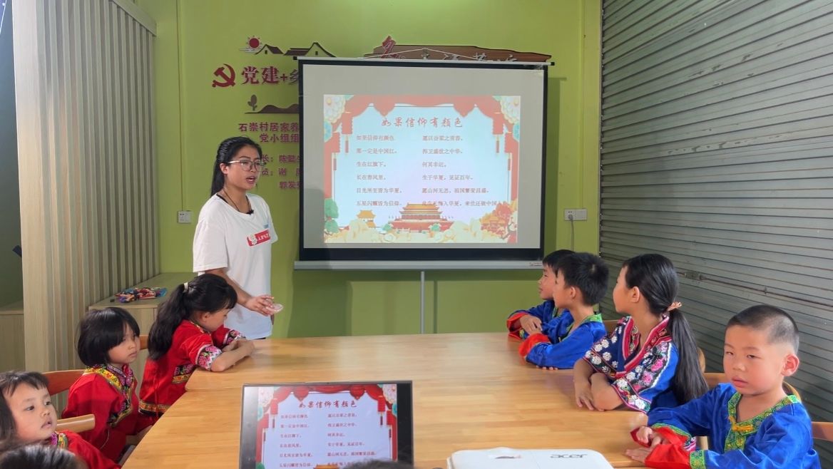 “如果信仰有颜色,那一定是中国红...”这段铿锵有力的朗诵词将活动推向高潮。国学经典环节,实践队员用标准的普通话发音,引导孩子们跟读,声音虽稚嫩,但每个字都充满了力量,品味着红色文化的韵律,感受着普通话的魅力。