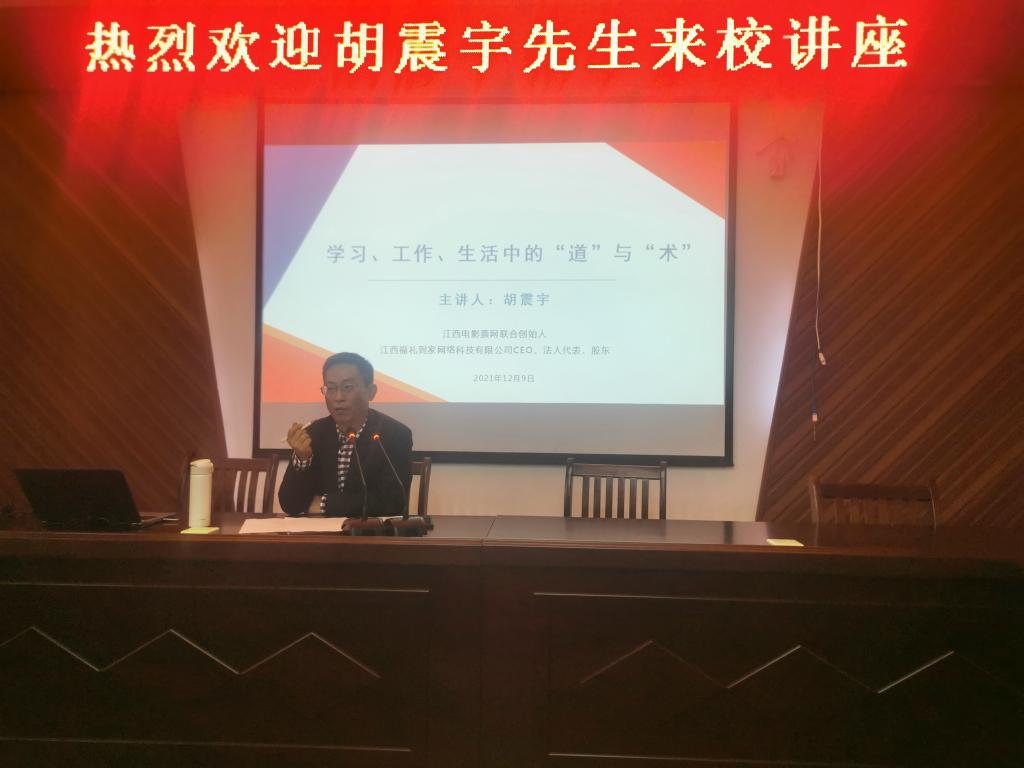 12月9日,江西电影票网联合创始人、江西福礼到家网络科技有限公司CEO、法人代表胡震宇先生应beat365在线唯一官网邀请在艺术楼A231会议室做了“学习、工作、生活中的‘道’与‘术’”的主题讲座,数字媒体艺术教研室部分专业教师和学生聆听了讲座。