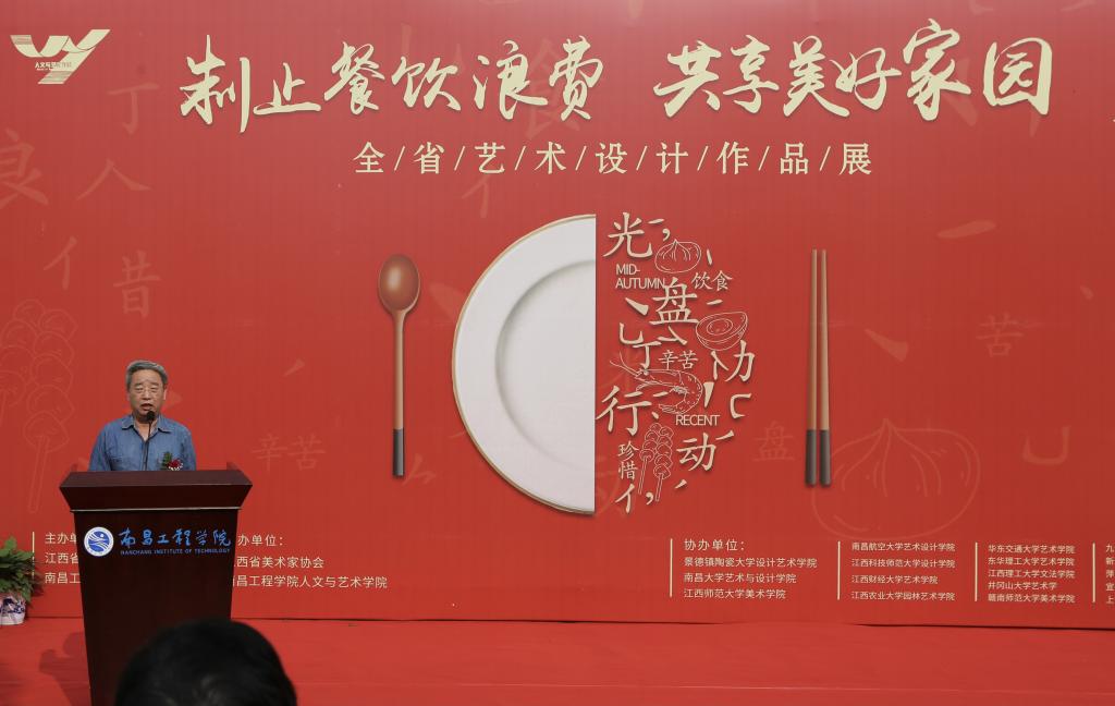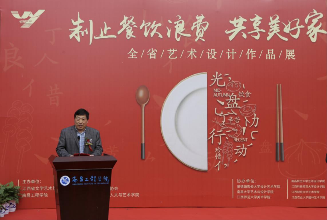 中国书法家协会副主席、中国美协理事、江西省文联副主席毛国典为开幕式致辞,他指出,本次展览是一次高水平的艺术设计展览赛事,表达了对“厉行勤俭节约、反对铺张浪费”的鲜明态度和坚定决心,并充分肯定了南昌工程学院通过举办艺术巡展、主题团日、课程思政、社会实践等多种形式倡导节约文明的做法和良好影响。