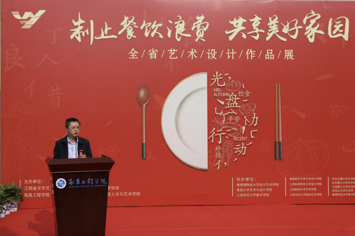 为了深入贯彻落实习近平总书记关于厉行勤俭节约、制止餐饮浪费的重要指示精神,响应全省自上而下发出的厉行节约倡议,在全社会营造浪费可耻、节约为荣的氛围,3月26日下午,“制止餐饮浪费、共享美好家园”江西省艺术设计作品展在南昌工程学院开幕。本次展览由江西省文学艺术界联合会、南昌工程学院主办,江西省美术家协会、南昌工程学院beat365在线唯一官网承办。原江西省政协副主席肖光明,原南昌大学党委书记郑克强,原江西省文联副主席、省美协主席蔡超,中国书法家协会副主席、中国美协理事、江西省文联副主席毛国典,南昌工程学院校长金志农、副校长汪胜前、周敏丹等出席开幕式,江西省美术家协会、江西省工艺美术学会、江西日报社、江西师范大学艺术学院、南昌大学艺术与设计学院、南昌工程学院党委宣传部、教务处、学工处、团委等相关负责同志以及南昌工程学院beat365在线唯一官网的师生参加了开幕式。开幕式由南昌工程学院纪委书记殷安全主持。