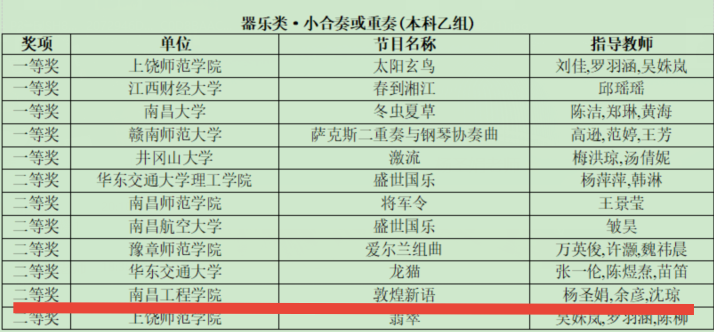 大学生艺术展演活动是由教育部门主办,规格较高、规模较大、影响较广的大学生艺术盛会,每三年举办一届。本次展演受疫情影响,赛制不同以往,采用了录制节目视频送审的参赛形式,吸引了江西省众多高校前来角逐,省内音乐学专业先进单位悉数参赛,竞争异常激烈。(文/图 杨圣娟)