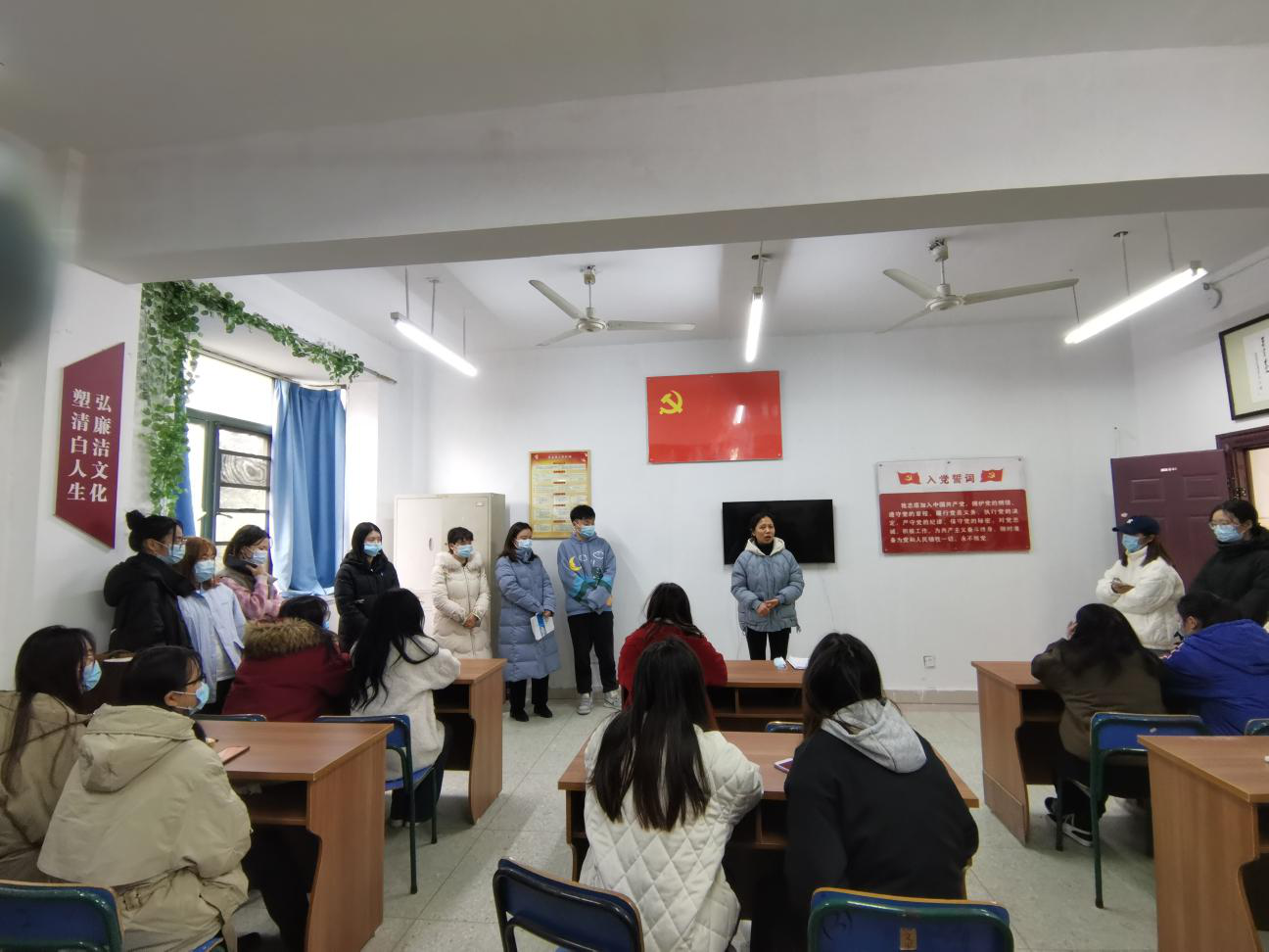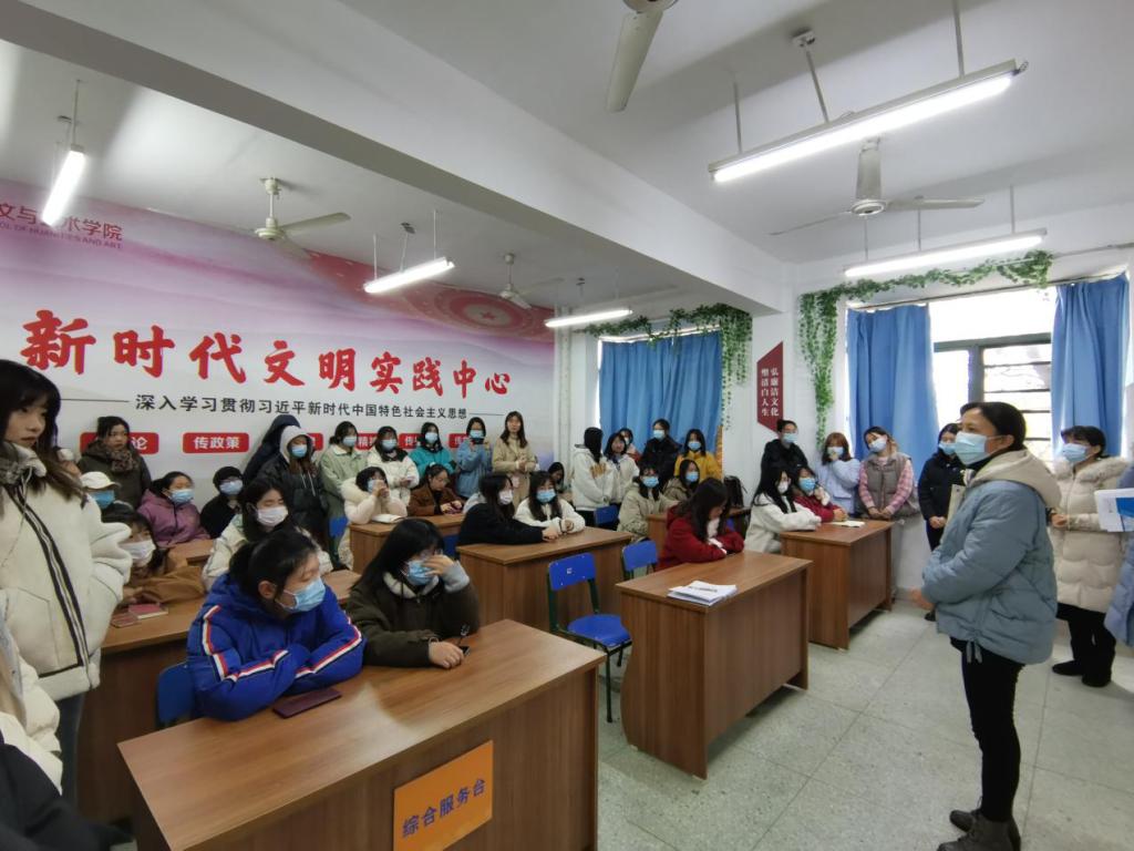 首先,王锐为大家普及安全教育知识,并列举出元旦期间楼栋晚归、破坏通道、异性闯入宿舍等恶性事件。紧接着,王锐结合具体案例,呼吁女大学生应提高安全防范意识、增强防范手段、强化安全意识、懂得辨别是非、提高防范能力。同时,王锐也从春运购票、疫情防控方面告诫同学们要牢固树立“安全第一,预防为主”的观念。接下来张淑华带领同学们一起学习了学生手册关于学生违纪处分的相关规定。