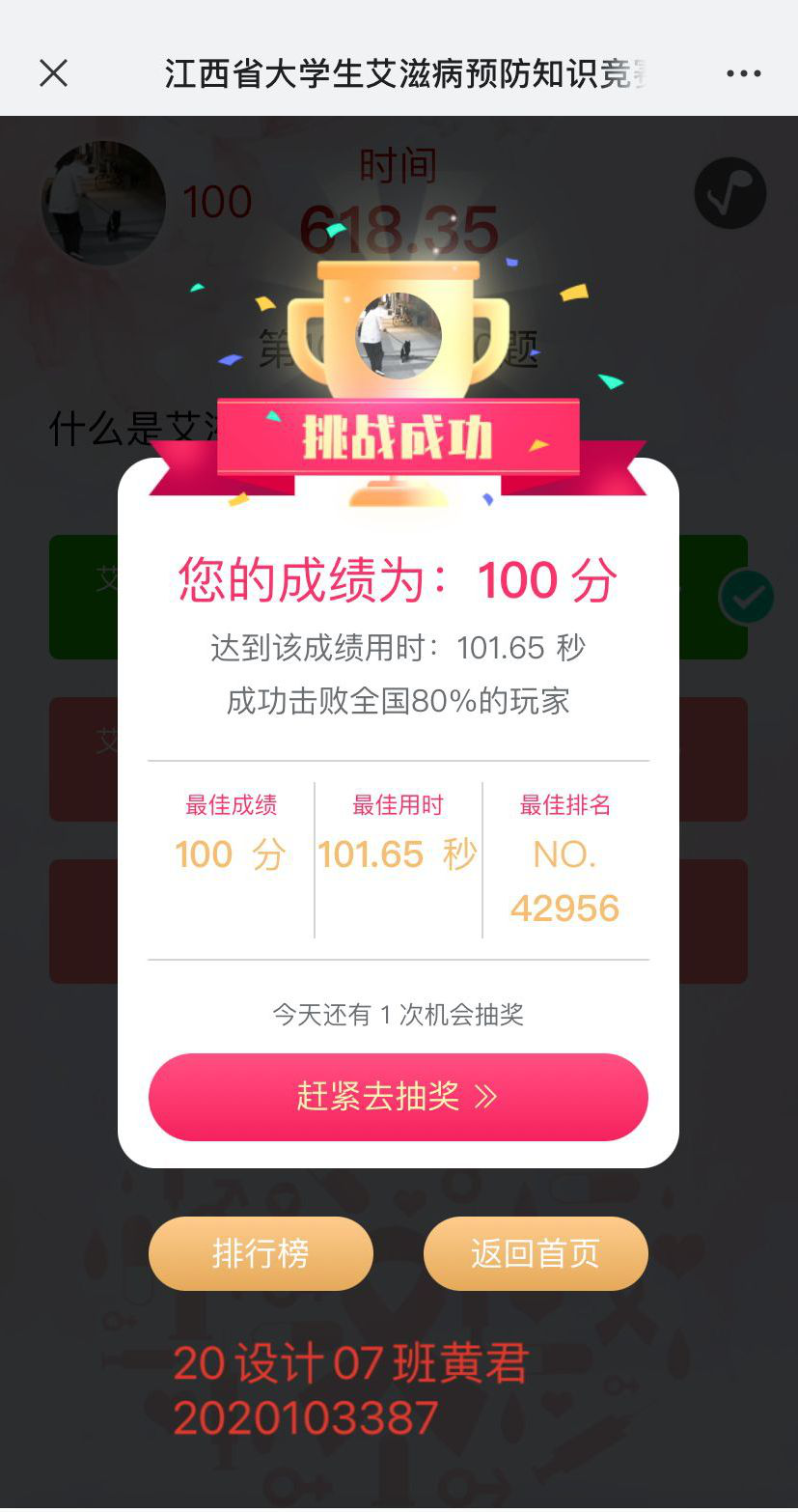 为提高师生的防艾意识,根据《关于开展2020年全省大学生艾滋病预防知识竞赛活动的通知》,beat365在线唯一官网于12月22日至12月31日开展大学生艾滋病预防知识竞赛活动。我院精心落实,认真有序组织学生按时参赛,在参赛答题的过程中提升师生的防艾意识,同时加深对艾滋病的认识。