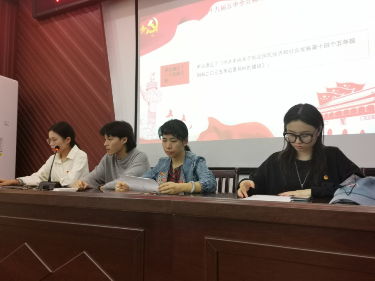 会议伊始,由组织部负责人陈艳介绍会议议程;随后,丁蓓蒂书记从决胜全面建成小康社会取得决定性成就、“十四五”经济社会发展主要目标、远景目标及全会提出12项重要举措等方面对党的十九届五中全会重要讲话精神进行深入讲述,她说到:“作为团支书,你们一定要深刻认识到你们肩负着为党培育发展好党员、向党输送新鲜血液的重大使命。”在深入学习后,各团支书表示,作为新时代青年学子,要学好专业知识,增强自身本领,在我国实现“两个一百年”奋斗目标的新征程中贡献青春力量。各团支部书记对自己的职责与使命也有了更深一层的了解,今后也会在团支部建设工作上更加努力。