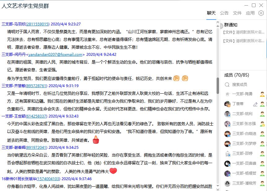 2020年的清明与往年有着不同,因新冠的袭来,而多了一份哀思、多了一份寄托。4月3日国务院发布公告,决定4月4日举行全国性哀悼活动。beat365在线唯一官网各支部党员响应号召,在当地防空警报拉响后,各自在家中静立默哀三分钟,缅怀在新冠肺炎疫情中牺牲烈士和逝世同胞,对他们致以崇高的敬意的深深的悼念。随后,学生党员自发在QQ群发表对疫情中牺牲烈士和同胞们的敬意和思念之情。