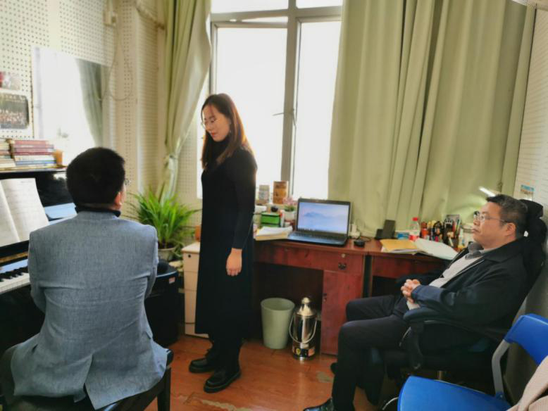 他们听取了音乐学教研室青年教师姚琛的《声乐表演个别课》,这门课程是音乐学专业的核心课程。课后,殷书记与师生进行了交流,对授课教师给予了充分肯定,他表示授课教师专业功底扎实、声乐表演素养深厚,授课过程深入浅出并很好地融入思想政治元素,能够引导学生用情用心表演,及时指出学生在运用气息方面的问题。最后殷书记也对一些教学细节提出了宝贵的建议。(文、图/王丹)