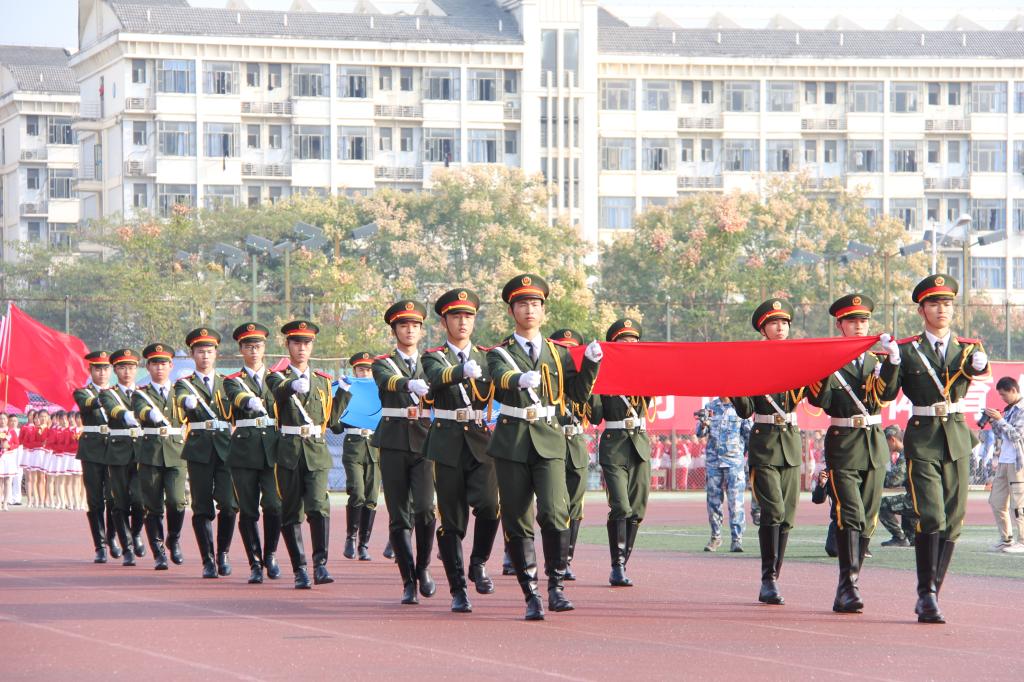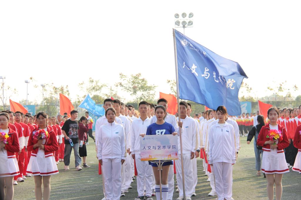 开幕式伊始,国旗护卫队和鲜花队在激昂的音乐声中迎国旗、校旗、会旗,各学院代表队紧随其后。我院分列式队员们精神抖擞,高声喊着“艺术殿堂,梦想起航;与梦同行,共创辉煌”的口号,迈着整齐划一的步伐走向主席台。随后,运动员及裁判员代表进行宣誓。仪仗队、运动员退场后,由我院新传专业部分同学参与的学生团体操表演《重返十七岁》开始,接着,我院部分老师参与的教职工大型团体操表演《舞进新时代》登场,最后,在蒿佳杭等老师领唱的《我和我的祖国》大合唱表演歌声中,本次开幕式落下帷幕。
