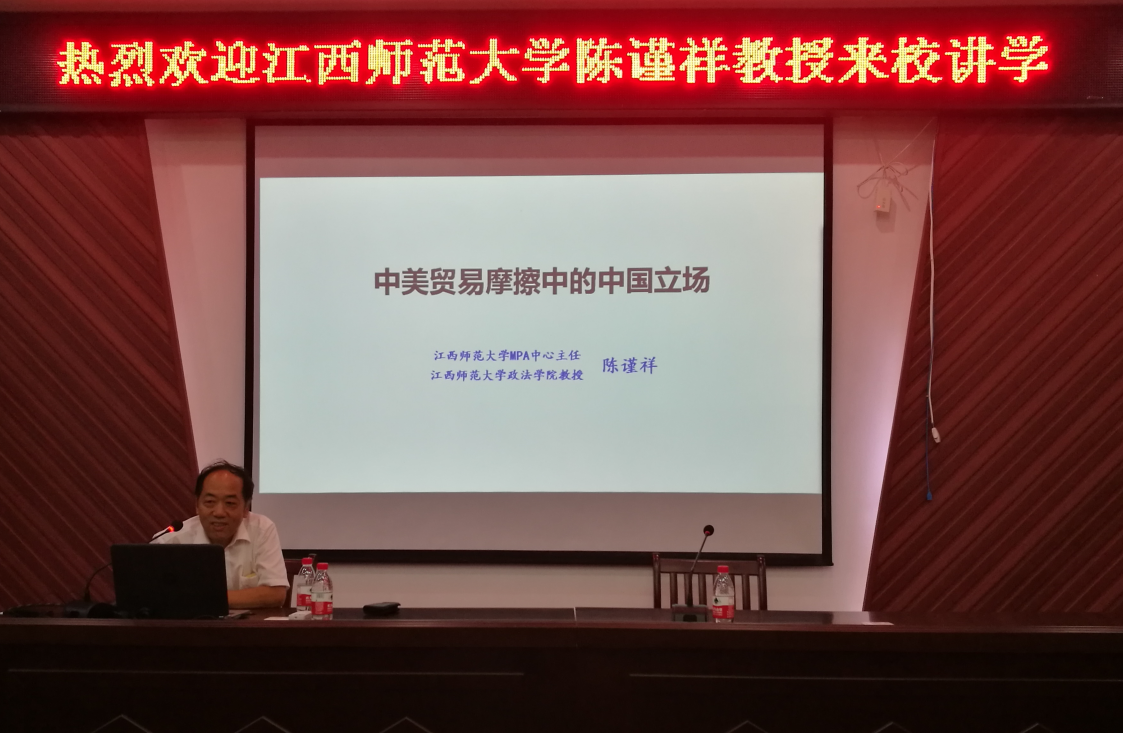 6月11日,江西师范大学陈谨祥教授做客“鄱湖学术讲坛”,在艺术楼A230会议室作题为“中美贸易摩擦中的中国立场”讲座。此次讲座由beat365在线唯一官网院长张朝霞主持,学院师生近100人聆听了讲座。