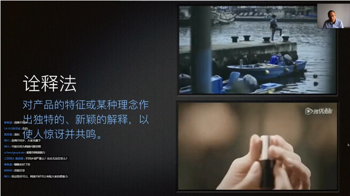 在线辅导课堂中,戴微星老师特别强调,大广赛要取得好成绩,要从科学组织、优选体例、巧妙执行这三方面下功夫。他给同学们重点介绍了悬念法、演示法、诠释法和实验法这四大广告创意与呈现的常用方法,并通过大量国内外经典获奖广告案例,阐述视频广告的创意技巧,为同学们讲授多种大广赛方法论与创意执行途径。