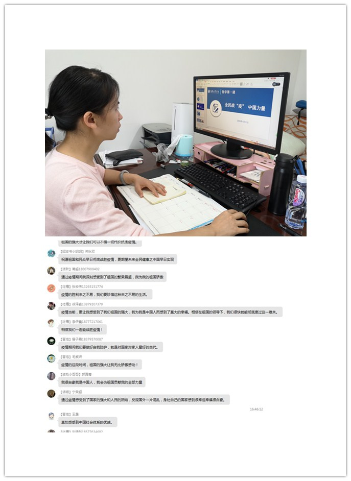6月1日,我院2020年春季学期“十百万”名师生同上一堂战“疫”思政课顺利开讲。我院处级干部、辅导员结合实际,以一名思政课教师身份通过线上方式,在联系班级和学生干部群体中讲授题为《全民战“疫”,中国力量》的思政课。