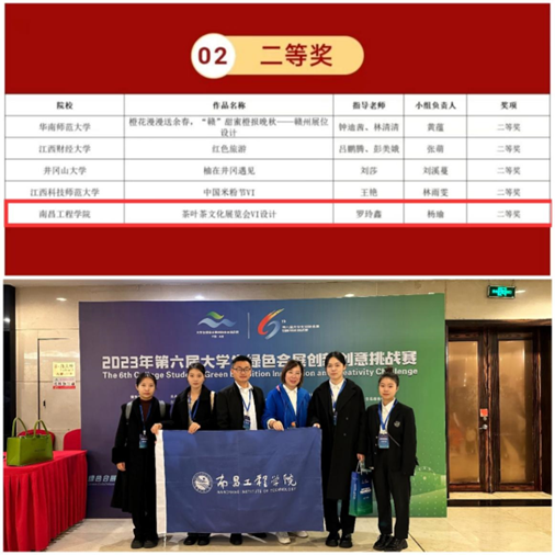 第六届大学生绿色发展创新创意挑战赛围绕“加快建设美丽江西,促进人与自然和谐共生,深入践行绿水青山就是金山银山理念,全面落实‘美丽江西’建设规划纲要,更高标准打造美丽中国‘江西样板’”这一主题进行,旨在为大学生搭建施展才能的舞台,为推动会展人才建设提供新方案、为会展业高质量发展提供新动能。全国50多所高校、120支队伍、500多名选手参加决赛。我院首次参加该赛事,经过初赛选拔,决赛路演,最终我院选送的《茶叶茶文化展览会VI设计》作品获得预赛第六名,国赛二等奖佳绩。