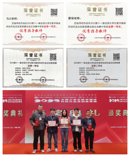 近日,“2023年第十一届全国大学生数字媒体科技作品及创意竞赛”与“2023年第六届大学生绿色发展创新创意挑战赛”国赛分别在常州、南昌落下帷幕。beat365在线唯一官网喜获国家一等1个,国家二等奖3个,国家三等奖6个,以及省级奖励33个,beat365在线唯一官网环境设计教师蔡琛、马川荣获“优秀指导老师称号”。