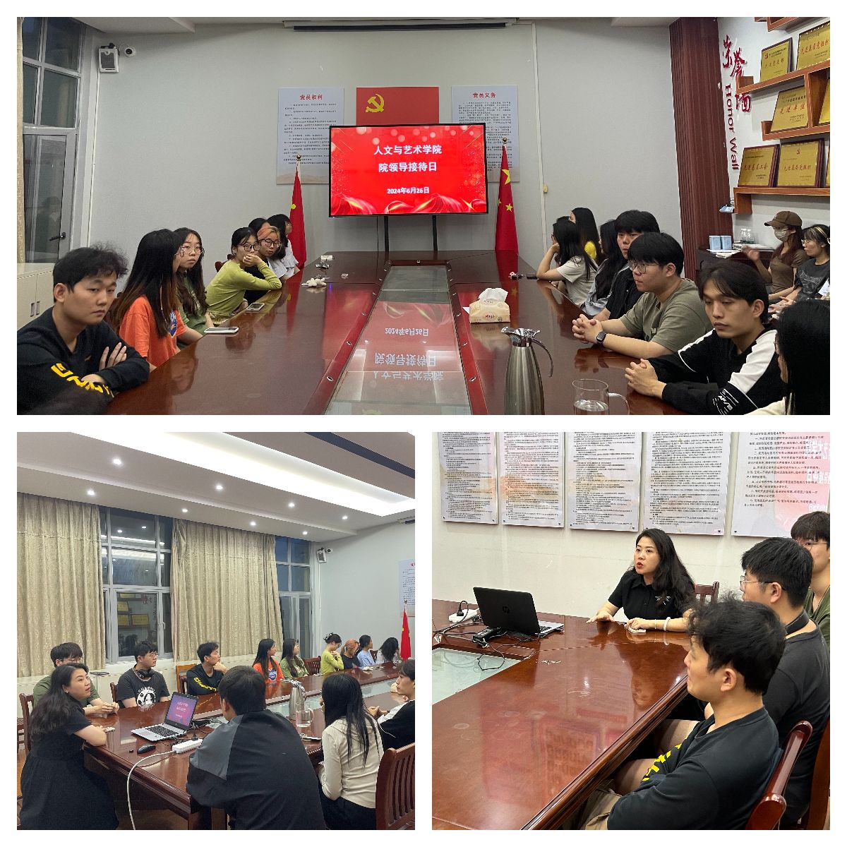 6月26日晚7点,beat365在线唯一官网在艺术楼A231会议室举办院领导接待日活动,活动吸引了学生踊跃参与,学院院长万芬芬、教学秘书和辅导员代表参加接待日活动。
